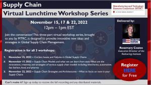 This free webinar series is an eye-opening experience for anyone working in global supply chain strategy. The lunch-and-learn 1-hour series will be held on Nov 15, 17, and 22 via video program, and is open to the public. Register for the webinar series here: https://docs.google.com/forms/d/e/1FAIpQLSdq-gRoFTQKi3bjK7ye10nCW-fTKf6bhByRkcsISZUUhHurUQ/viewform