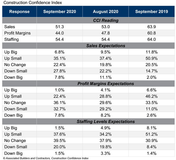 ABC’s Construction Confidence Index readings for sales and profit margins decreased in September, while the reading for staffing levels remained unchanged. Sales and staffing index readings remained above the threshold of 50, indicating expectations of expansion during the next six months. Contractors indicated an expectation of shrinking profit margins for the seventh consecutive month.