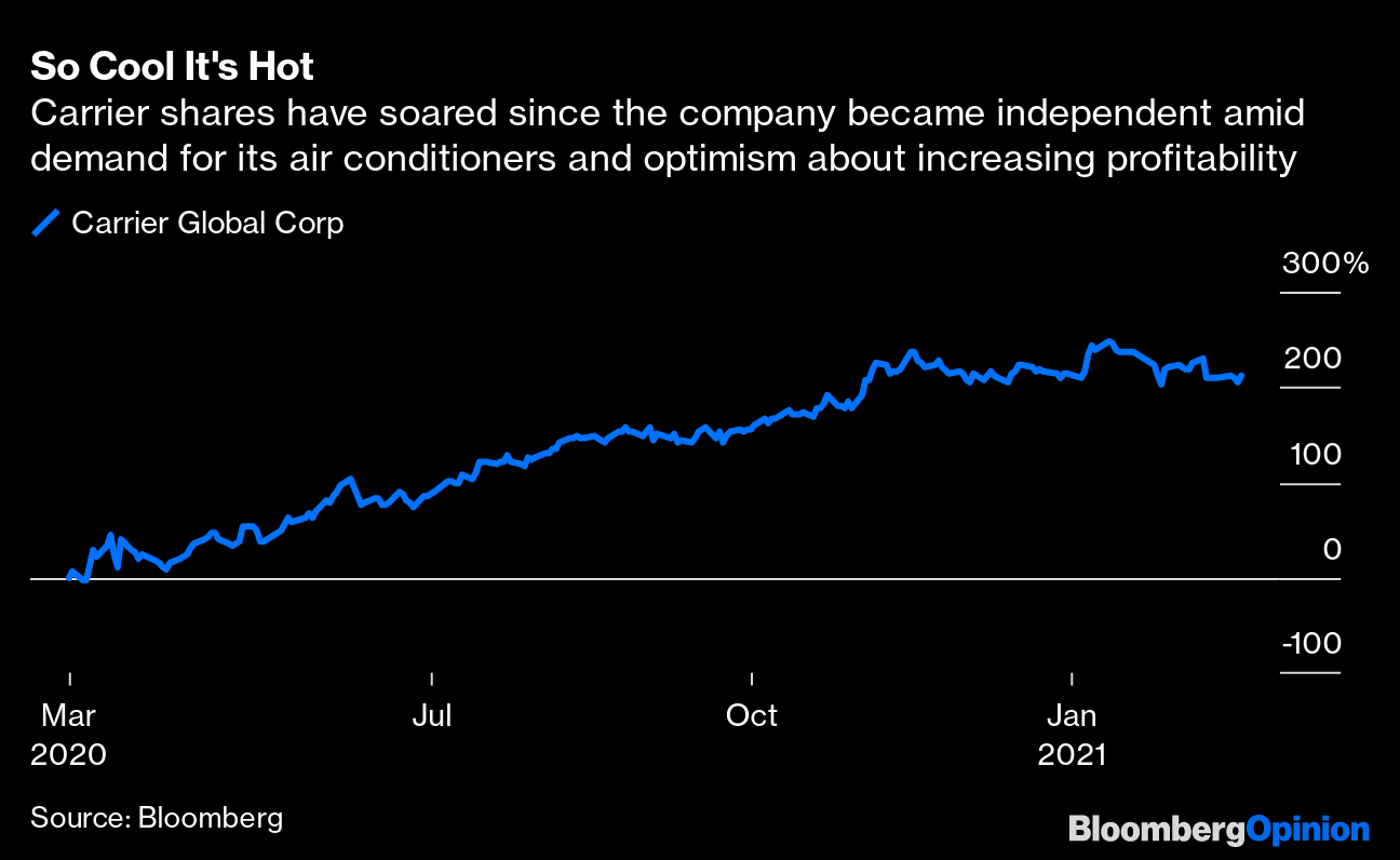 Carrier shares have soared since the company became independent amid demand for its air conditioners and optimism about increasing profitability