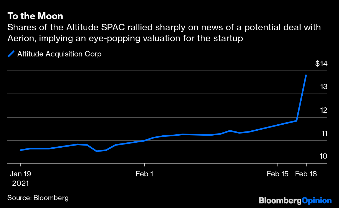 More SPACs. Aerion Corp., which designs supersonic planes and counts Boeing as an investor, is in talks to go public through a merger with special purpose acquisition company Altitude Acquisition Corp., people with knowledge of the matter tell Bloomberg News. The transaction would value the combined entity at about $3 billion. The company is aiming to start production on a supersonic business jet powered by GE jet engines in 2023. If that doesn’t pique your interest, there’s also going to be an electric jet-ski SPAC. Taiga Motors, which also makes electric snowmobiles, will merge with a blank-check firm sponsored by Canaccord Genuity Group Inc. for an implied market value of C$537 million ($422 million). And in case you missed it, my colleague Chris Bryant’s take on the risks of investing in the plethora of futuristic air-travel technology companies that have gone public recently is worth a read.