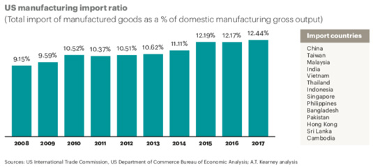 However, A.T. Kearney’s report shows that U.S. manufacturing output has increased by only 1% since 2013, compared with the 19% growth in imports of manufactured goods from the aforementioned 14 countries: China, Taiwan, Malaysia, India, Vietnam, Thailand, Indonesia, Singapore, the Philippines, Bangladesh, Pakistan, Hong Kong, Sri Lanka and Cambodia.
