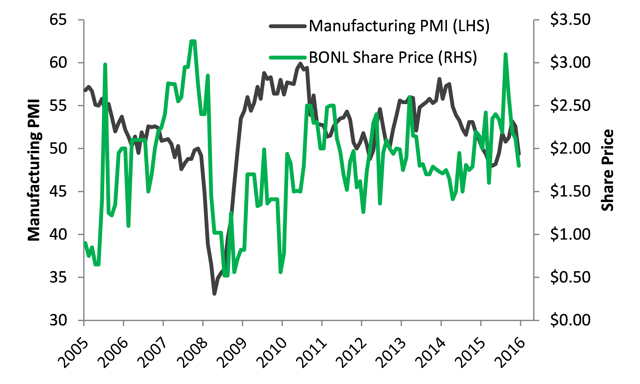 About half of Bonal’s annual business is repeating (42% in both fiscal 2015 and 2016). And about 80% of its revenues are in the U.S. mostly stemming from equipment sales. As such, the business will remain levered to the health of the U.S. metalworking market and by extension the health of the U.S. manufacturing sector. The chart below shows Bonal’s share price performance overlaid with the U.S. Manufacturing PMI which is an indicator of purchases in the manufacturing space. While the two are not particularly correlated, one reason for this is the illiquidity of Bonal shares.