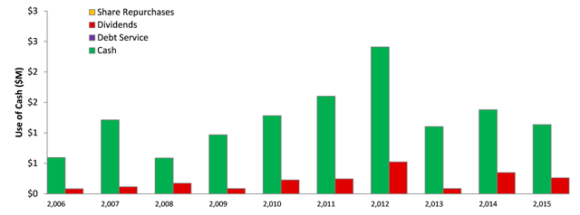 Use of Cash: the use of cash test provides a visual overview of the various cash uses that a company has been allocating cash towards. It shows the relative size of the cash uses versus the outstanding cash balance available to the company. It is a quick and simple way to view how the company has used its cash over the past 10 years, and is indicative of what the company may do in the next 10 years with its cash reserves. We examine dividend payments to all shareholders (including payments to preferred dividend holders) as well as net repurchases which includes equity issued via stock option plans etc… as well as interest payments on debt, this offers a more wholesome view of how the company allocates capital.