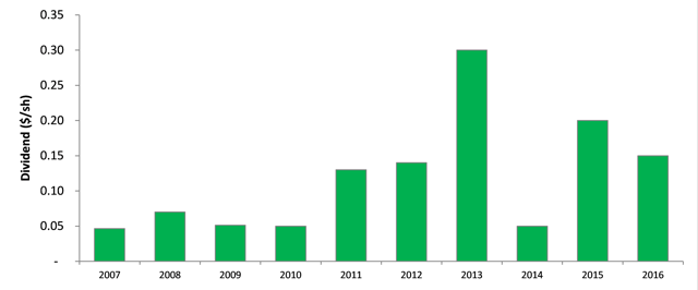 The company prides itself on a dozen profitable years across varying market conditions, and has paid dividends for 11 consecutive years. Despite a solid history of paying dividends, the number of annual payments has been lumpy, and one cannot necessarily extrapolate the LTM dividend payments to determine a forward yield. While some dividend is likely this year, with one bad quarter already behind them, it is unlikely we see more than one or two $0.05/sh payments this year, indicating a forward yield is likely in the 3% to 6% range, still fair. If the metalworking market turns around we could easily see $0.20/year dividends return which would be a catalyst for the stock.