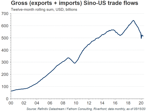 As the epicenter of the world’s first COVID-19 outbreak, China was first praised and then roundly criticized for its handling of the epidemic. US officials led by the president have further stepped up the criticism, with officials suggesting in May that the virus may have emanated from a lab in Wuhan and labelling COVID-19 ‘the Chinese virus’. None of this anti-China sentiment is anything new for the current administration, which has made China’s trade imbalances with the US a central part of their platform since coming to power in 2016. Overall US-China trade has continued to shrink since 2019 (see chart, below), suggesting to us that the unwinding of tariffs is a superficial ‘band-aid’ on a deeper issue.