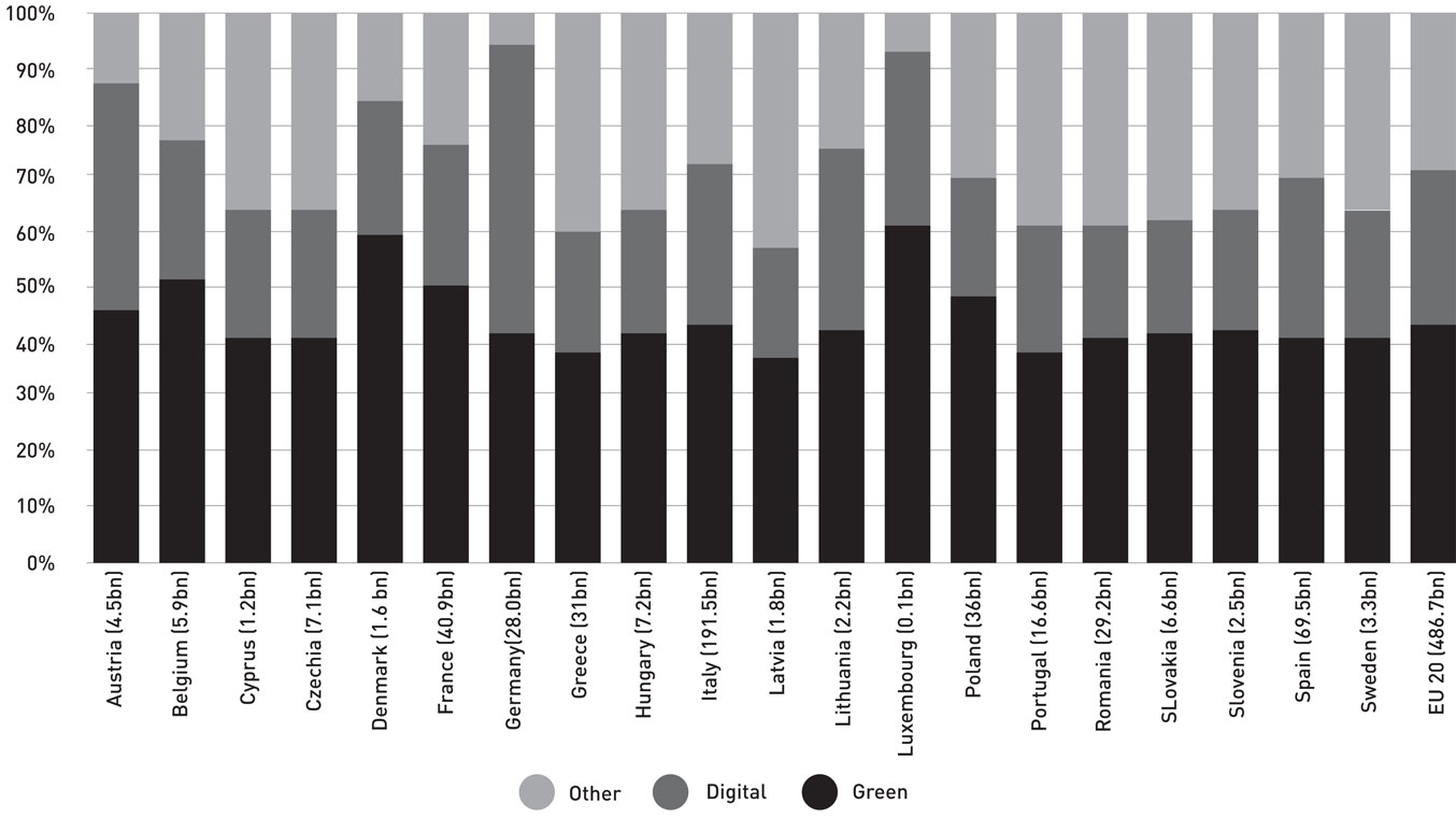 Each member state’s recovery and resilience plans must allocate at least 37 per cent of expenditures to support the green transition, and at least 20 per cent must go towards digital transformation. As at October 2021, those targets have been significantly exceeded in the plans approved for 20 European Union member states.