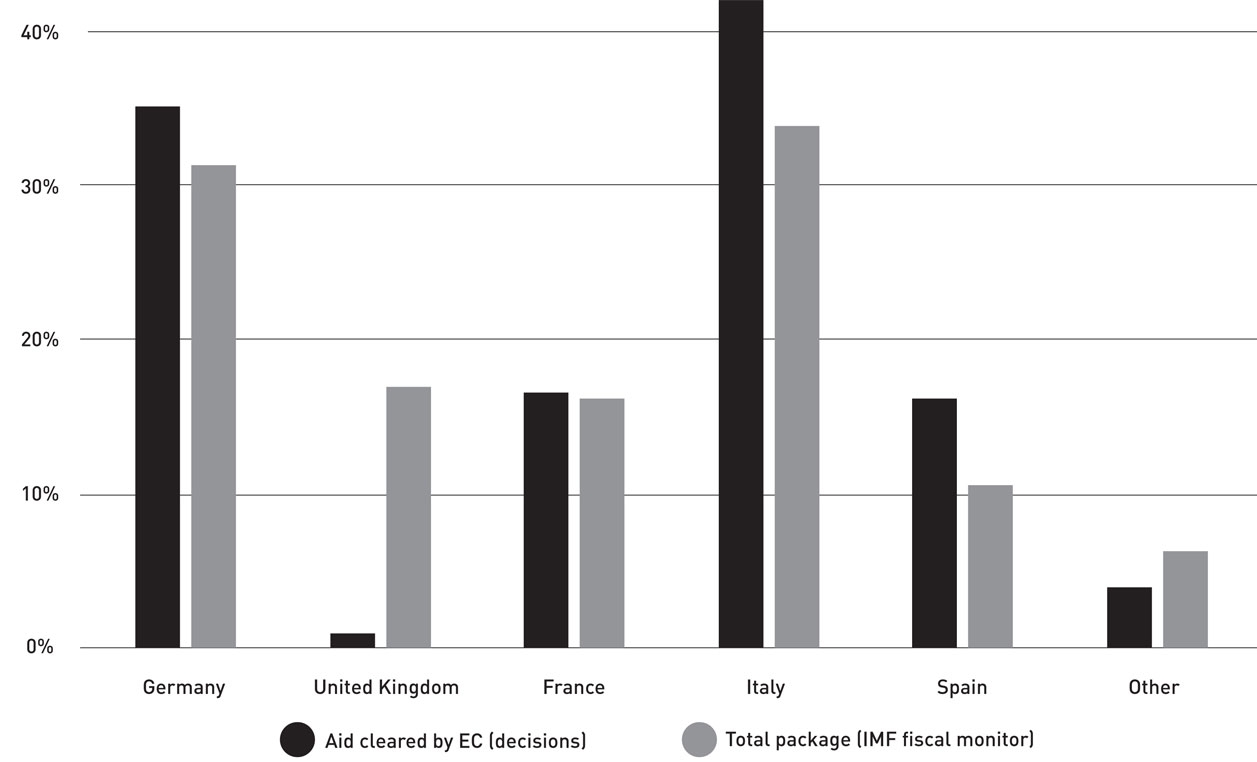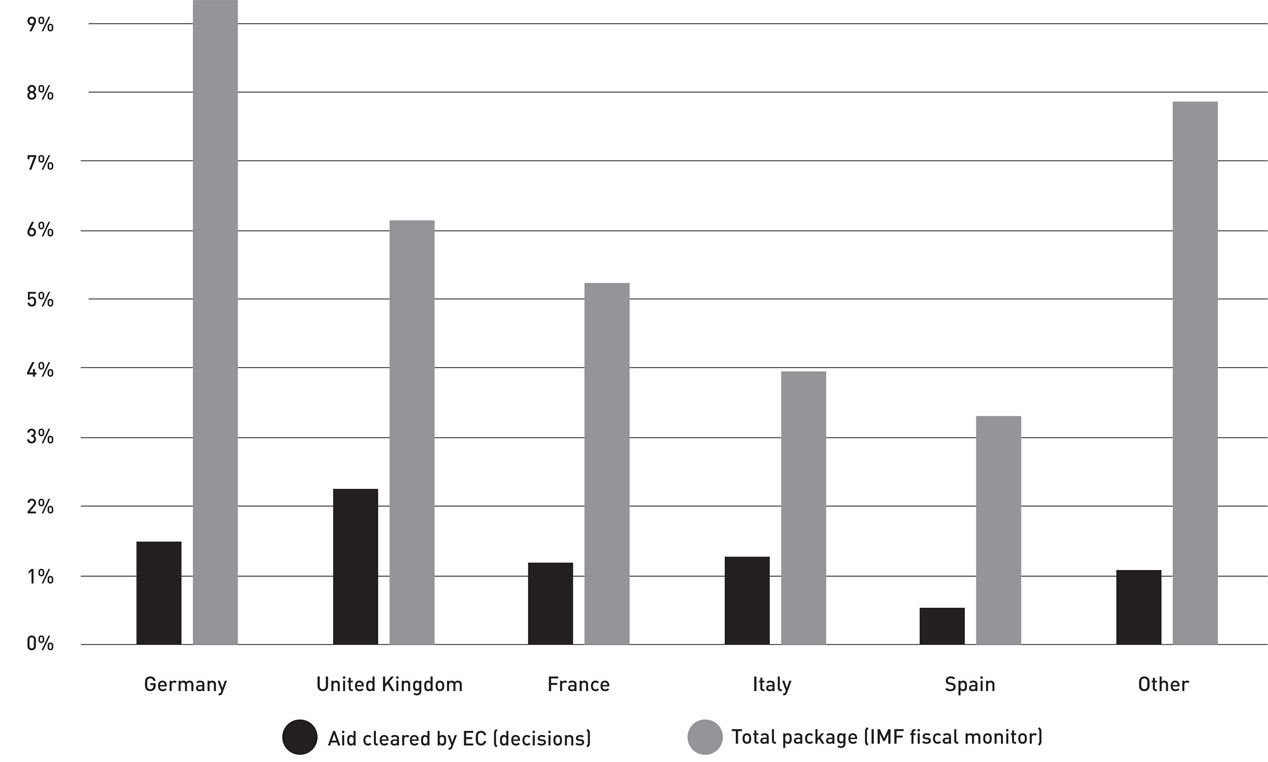 In Europe, despite the historical issuance of common debt by the European Commission, the policy response has, for the most part, remained national and has required that the rules that normally restrict national government actions be relaxed. In particular, the activation of the general escape clause of the Stability and Growth Pact, which suspended the application of European fiscal rules, and the adoption of the ‘Temporary framework for state aid measures to support the economy in the current covid-19 outbreak’ (the Temporary Framework), which clarified ex ante which aid measures would be compatible with European state aid rules, removed European constraints on sizeable national interventions.