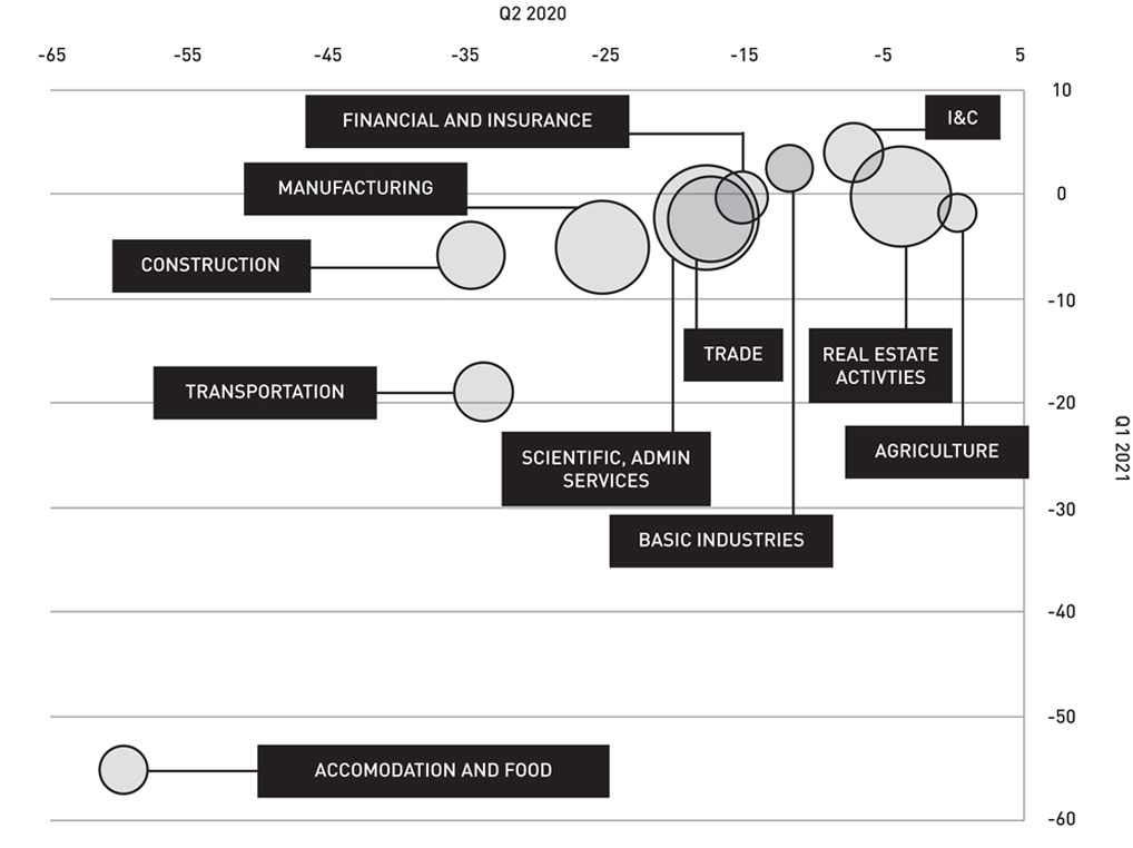 The horizontal axis shows that, by the end of the second quarter of 2020, economic activity in the hospitality, construction, transportation and manufacturing sectors was more than 20 per cent lower than before the crisis. By the end of the first quarter of 2021 (shown on the vertical axis), many sectors had already experienced a strong rebound; however, other sectors such as the transportation and hospitality industries are still suffering from a protracted contraction.