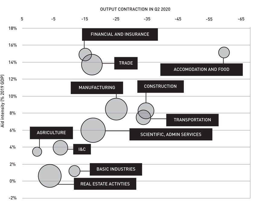 France publishes sectoral data on the actual allocation of guarantees by sector. As expected, the data reveal a strong link between the extent of the output collapse in a sector and the amount of credit support received (Figure 4); however, there appear to be some exceptions. Firms in the trade and finance and insurance sectors appear to have benefited, in relative terms, from a much greater level of support. Whether the surprisingly large amounts of credit support received by the trade, financial and insurance sectors were warranted is beyond the scope of this analysis. But establishing those patterns is a necessary first step in the monitoring of aid measures.