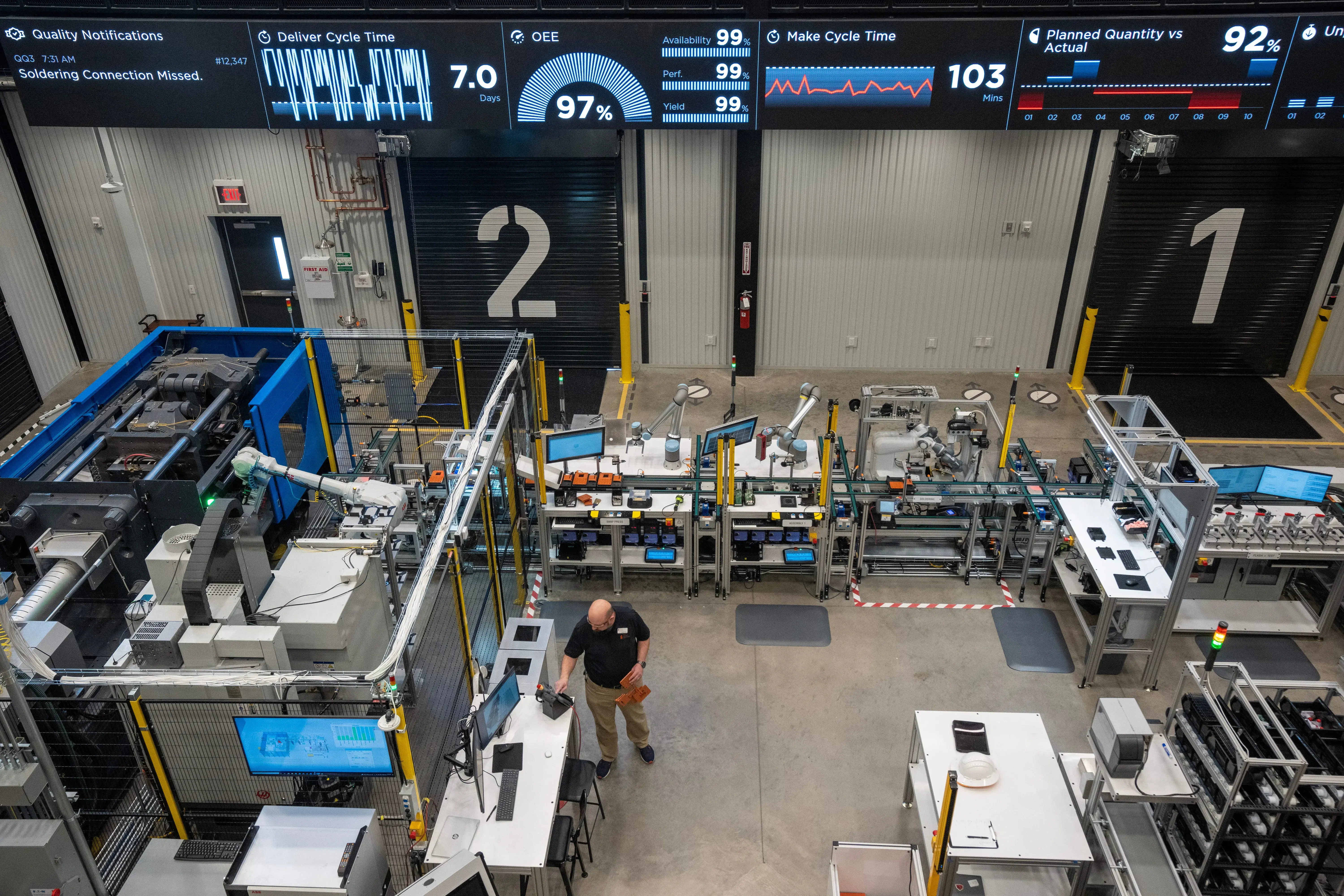 Overlooking the factory floor is a command center with a wall-size, live dashboard providing a holistic view of the operations. The entire facility is powered by a renewable energy grid outfitted with wind trees, solar panels and smart lighting, resulting in a net-zero environmental impact, according to Deloitte.