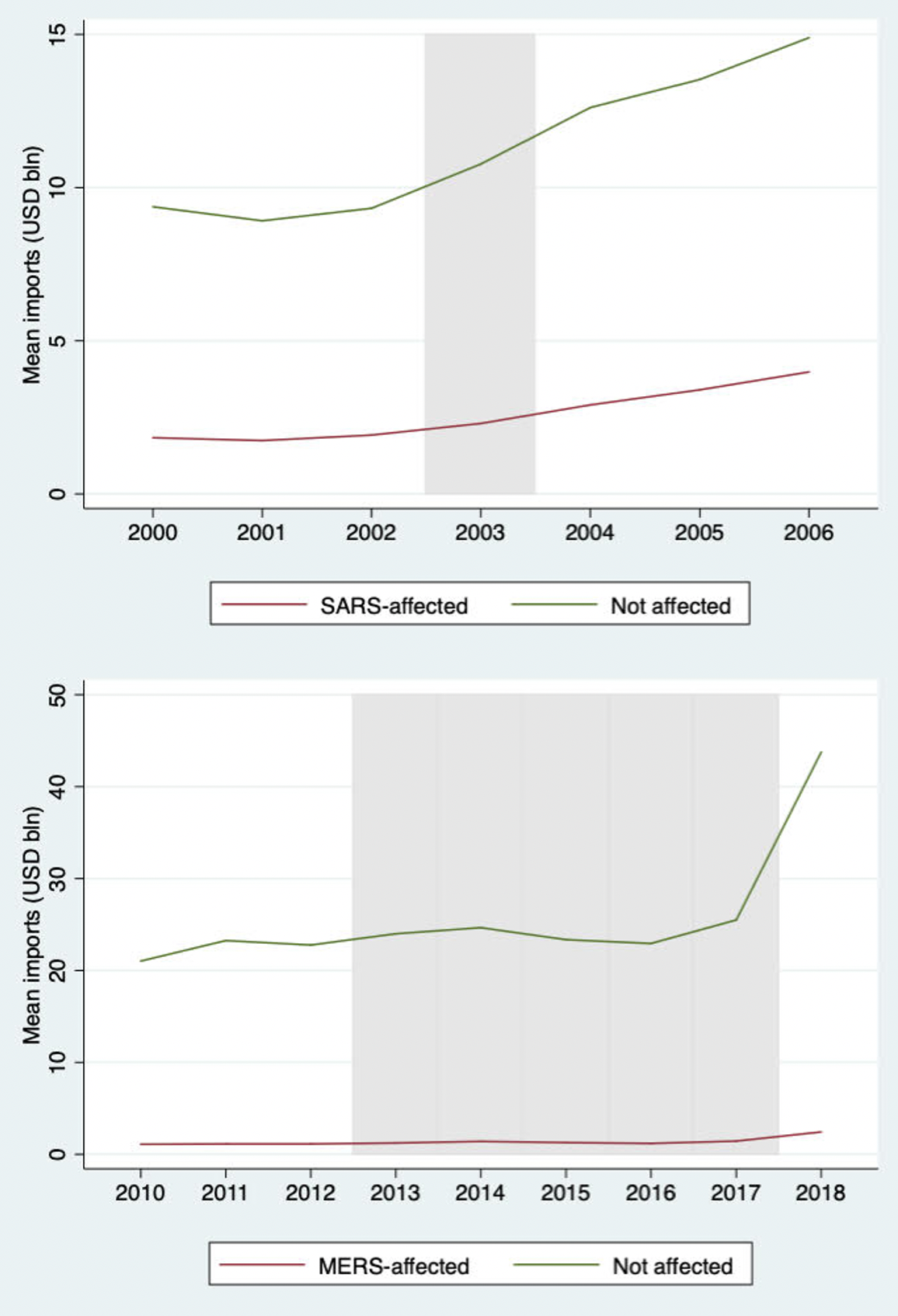 Figure 1 Mean cumulative imports of GVC-based products from worst-affected SARS (top panel) and MERS (bottom panel) countries and unaffected countries overtime