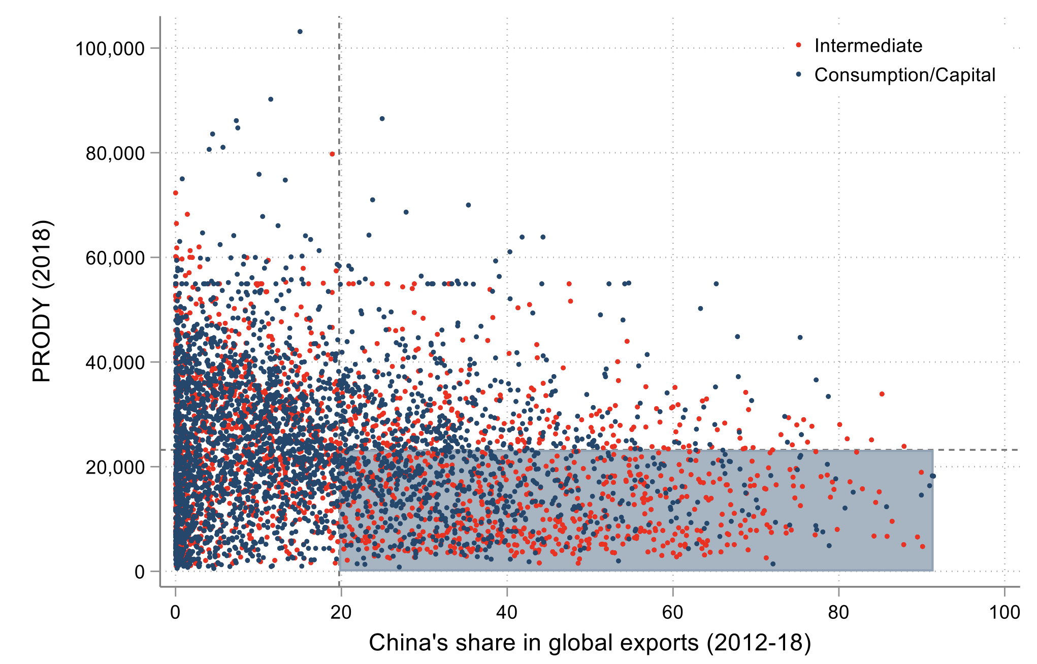 What products are most amenable to shifting to developing countries? Figure 3 shows China’s share in global exports for all HS 6-digit products and the income level of the typical exporter of the product (the so-called PRODY index). Products in the bottom right quadrant are products where China is the main exporter and production could shift relatively easily to other developing countries. The over 1000 products in this group contain both intermediates and final goods. In general, the top China share and low PRODY products tend to be simple manufactures and mostly final goods. Within autos and electronics, the products in this category are mainly inputs for radios and televisions. One important caveat is that governments are likely to target policy interventions on strategic industries, such as high-tech goods and health products. Given that many of the products where the world is most dependent on exports from China are simple manufactures– things like umbrellas, Christmas tree lights, electric toasters, and artificial flowers –the scope for developing countries to benefit from reshaping resulting from policy intervention may be limited.