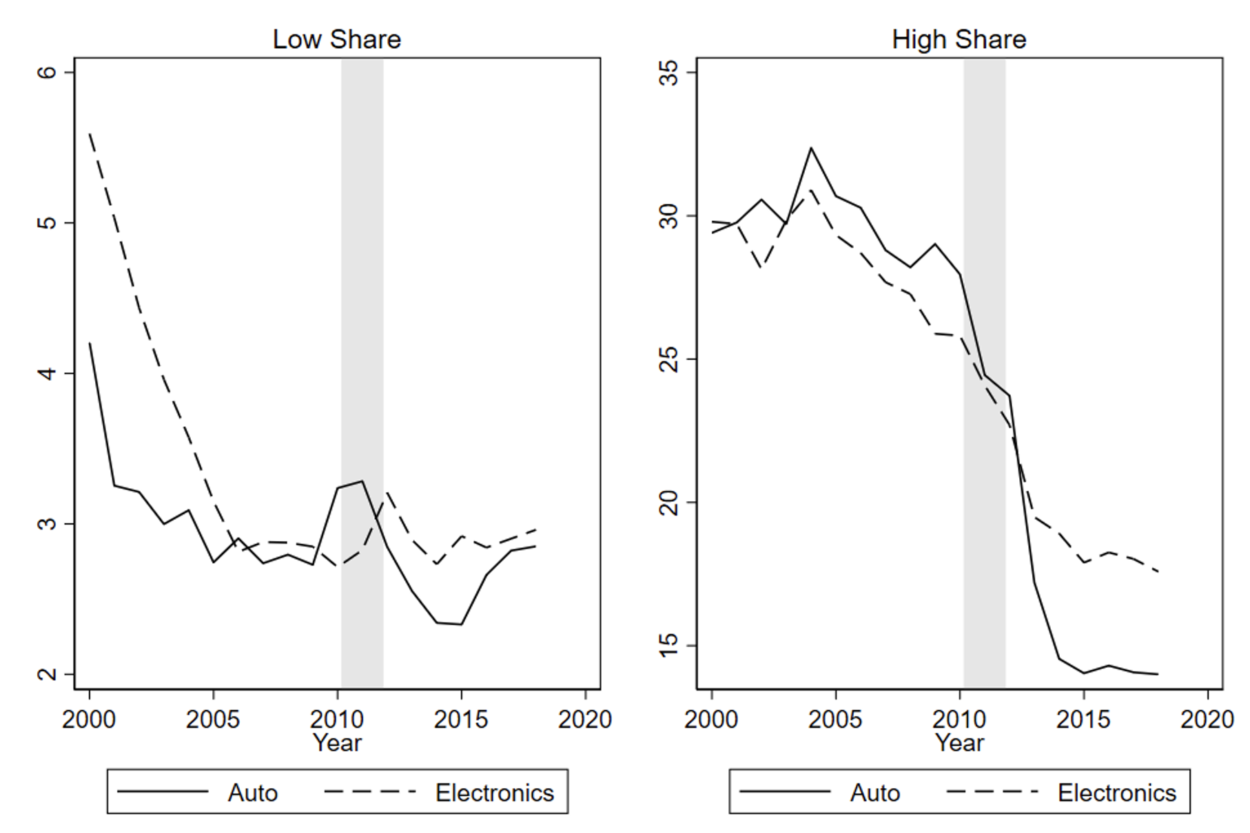 Notes: The figures plot Japan’s average market share for auto and electronics for country-products in which Japan had an average market share below 15% (left panel ‘Low Share’) and in country-products in which Japan had an average market share greater than 15% (right panel ‘High Share’) calculated over the 2004-2010 period. The sample for auto is restricted to the 15 largest auto producers and for electronics to the 15 largest exporters of final electronics (because country-level production data is not available for electronics), in both cases Japan is excluded.