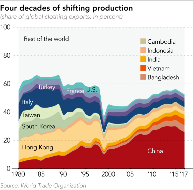 Other countries have also ridden the wave. Bangladesh, in particular, has specialized in producing very basic garments for international businesses, and is now second only to China as an exporter.