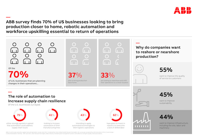 Surveying 1,610 executives in the US and Europe, ABB found that 70 percent of US businesses are planning changes in their operations, with 37 percent planning to bring production back home and 33 percent looking to nearshore and shift their operations to a closer location.