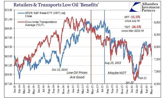 I believe this is yet another reason why, as noted yesterday, transportation (and retailer) stocks have yet to recover from January/February’s liquidations. These truck stories and pieces of data may all yet still be anecdotes and partial pictures, but they are adding up to already seriously elevated risk of something more than the mainstream views on the economy allow as possible. Today’s employment report, meaningless and irrelevant as it truly is, will not help as it was, with lower oil prices, about the only hope left for escaping economically undamaged. Since we are already discussing serious setbacks in trucking and transportation, obviously those low oil prices never counted for anything.