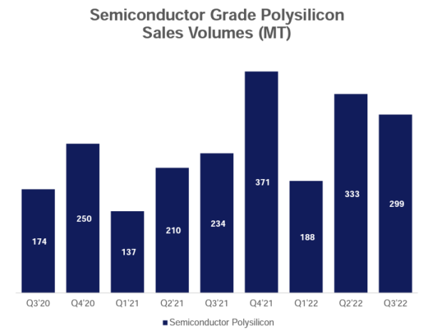 REC Silicon ASA, a producer of silicon materials to the PV and electronics market, sold 299 metric tons of polysilicon in Q3, a decrease of 24.7% from 397 metric tons sold in the same quarter a year ago. Silicon gas segment sales were down about 19.5% in the same timeframe to 586 MT in Q3 22 from 728 MT in Q3 21.