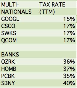 Perhaps, the hardest hit companies have been the regional banks – and they would be the most helped by the Trump tax rate cut. Banks like Bank of the Ozarks (NASDAQ:OZRK), Home Bancshares (NASDAQ:HOMB), Pacific Continental Corporation (NASDAQ:PCBK), and Signature Bank (NASDAQ:SBNY) all pay at least 36% U.S. and state income tax.