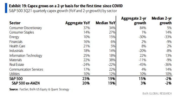 With third-quarter earnings now under way, S&P 500 companies are showing a 15% increase in capex on a two-year growth basis, according to the BofA report. That growth rate drops to 3% when excluding e-commerce giant Amazon.com AMZN, +2.15%, the analysts said.