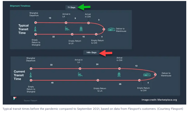 Currently, goods that would normally take 71 days to make a round-trip journey from Shanghai, China ports to U.S. warehouses, now take over 149 days.