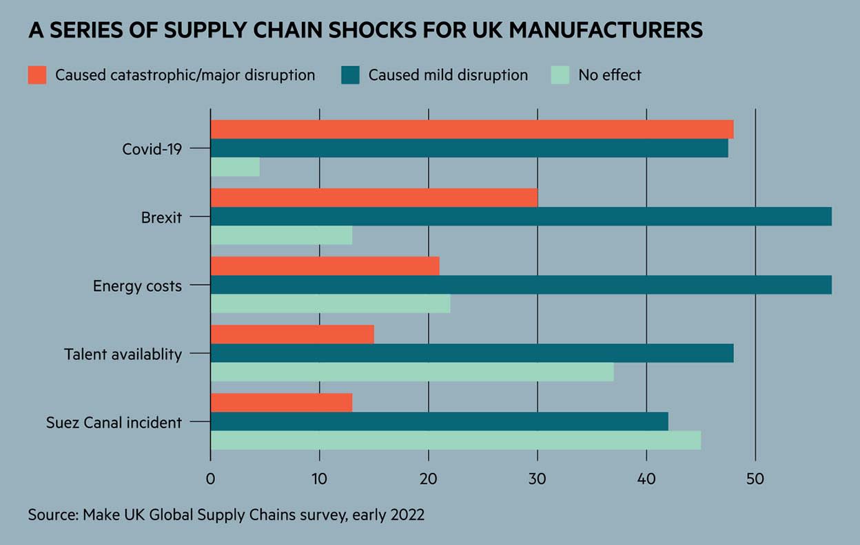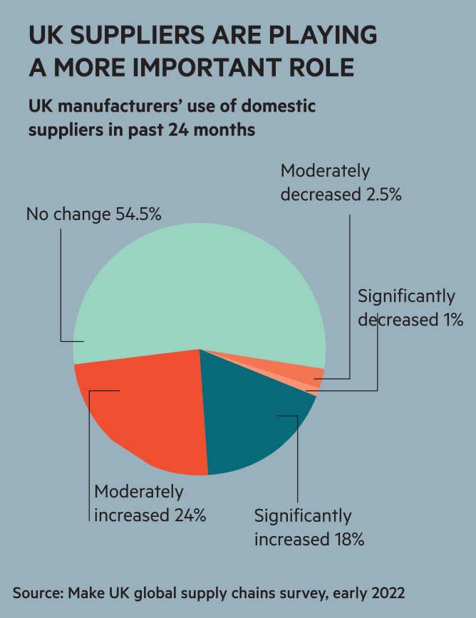Nor is it just globalised companies that are finding limits to the benefits of globalisation. There is evidence UK businesses large and small have been bringing production back to home in recent times. A study from manufacturing trade group Make UK published earlier this year found that 42 per cent of British companies had increased their number of domestic suppliers in the past two years, with a similar proportion saying they intended to make further moves in this direction prior to 2024. Notably, the survey was conducted prior to Russia’s invasion of Ukraine – in this regard it is significant that almost 80 per cent of companies said they had already experienced disruption as a result of rising energy costs, which were cited as the third most significant disruptive factor after the pandemic and Brexit.