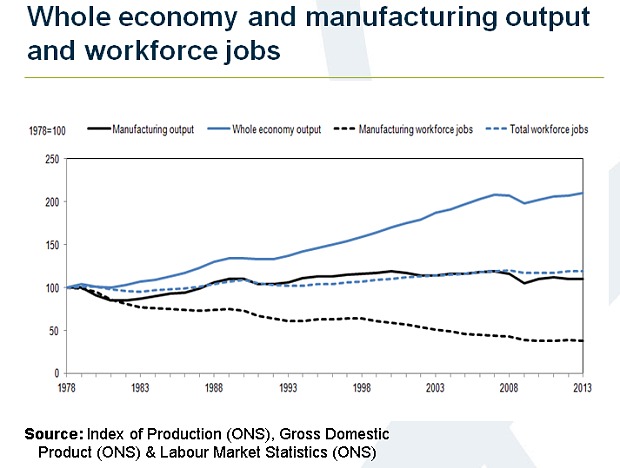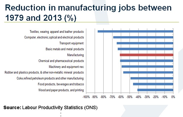 For a start, manufacturing is becoming very much more capital intensive. Developments in robotics and other forms of mechanisation are levelling the playing field and destroying the comparative advantage enjoyed by China and other low labour cost producers. This is already leading to some “onshoring” of production, particularly in textiles, an industry laid to waste by emerging market competition. However, these developments also mean that even if manufacturing were to make a big comeback in the UK, it would be unlikely in itself to create many jobs. Mass, production line employment is increasingly a thing of the past.