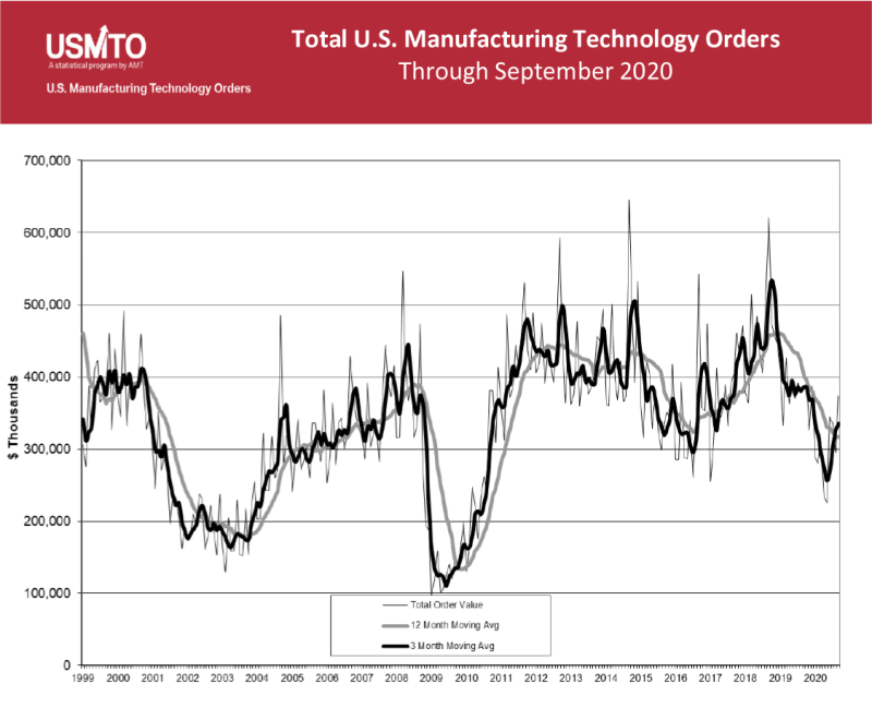 U.S. Manufacturing Technology Orders totaled $373.7 million in September 2020, an increase of 26.4% from August 2020, and the highest monthly total of the year, according to the latest U.S. Manufacturing Technology Orders report published by AMT – The Association For Manufacturing Technology. The September total decreased 3.2% from September 2019, and orders to date reached $2.68 billion, nearly a quarter lower than the 2019 YTD total.
