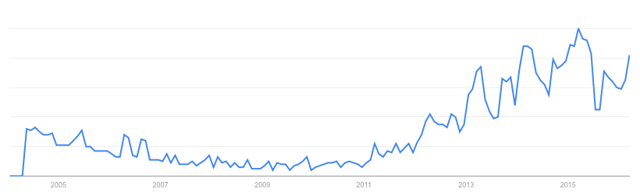 Finally, the trend toward offshoring looks to be in the process of reversing as overseas labor costs rise and companies focus more and more on the potential quality and branding benefits of “reshoring.” Google trends shows a surge in the popularity of this search term in recent years.