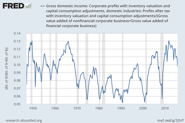 These three secular trends have provided a tailwind for profit margins for a long time now. However, they may be reaching, or have already reached, their full potential and begun reverting. In terms of interest rates, the Fed Funds rate has essentially been stuck at zero for seven years now. Corporate spreads hit rock bottom almost two years ago and have been reversing course ever since. Furthermore, after a long period of deregulation in the banking industry that saw lending standards loosen considerably, it appears that regulation is making a sustained comeback and the effect will likely be just the opposite.