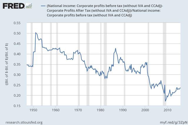 Second, corporate taxes as a percent of income have been falling for a long time, as well. Recently, this may be due in large part to the growth of tax avoidance strategies, mainly those involving relocating corporate headquarters to tax havens.