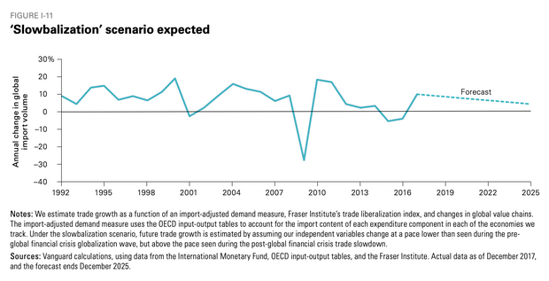 This chart from Vanguard’s global outlook for 2021 tempers the “overly pessimistic” view that rapid deglobalization will come in the wake of the COVID-19 pandemic. Instead, the group’s report said, “the current wide extent of economic and financial linkages poses challenges to a widespread reshoring back home, suggesting that the more likely path forward is a gradual slowdown in trade.” This, they say, is the coming “slowbalization.”